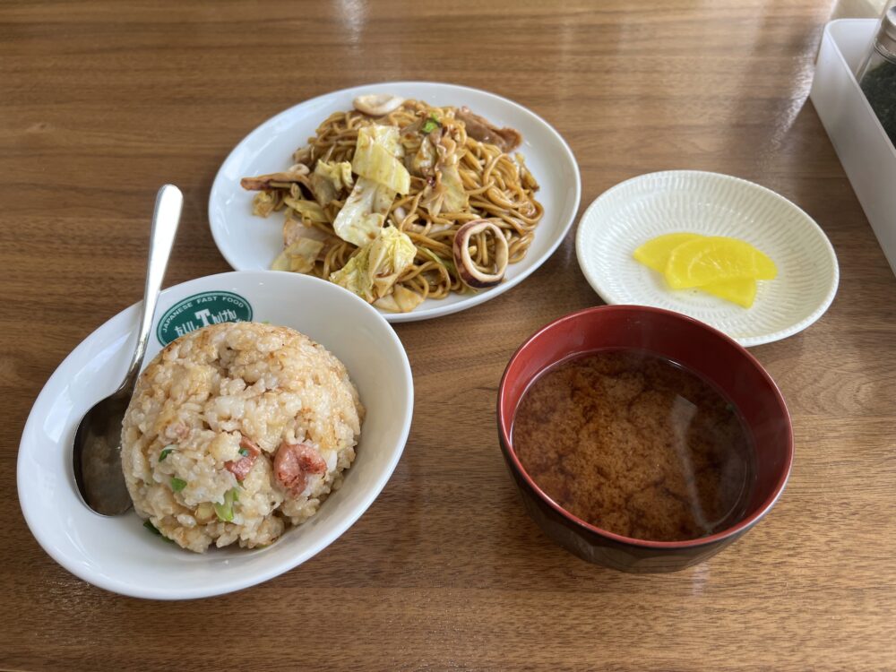 入店後席につきメニューを眺めていると、豚肉とイカが入っているミックス焼きそばのセットが目に入りました。
